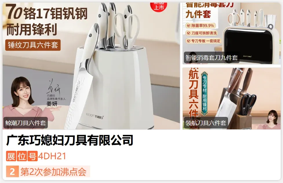 巧媳妇创立于1994年,是一家厨房刀具研发设计、制造、销售服务一体制造企业,以生产销售:刀具、五金厨房用品等。2006被评为“中国刀剪十大品牌”;2017年邀请影视巨星刘涛为品牌代言人;2019年荣获“阳江十大名刀”称号;2024年签约演员姜妍为品牌代言人。2024年荣获“广东老字号”荣誉;巧媳妇与国内数十家品牌商场保持合作,产品遍销国外及国内的城市。与各大直播网红;如辛选集团长期战路性带货合作-展位号:4CH21-