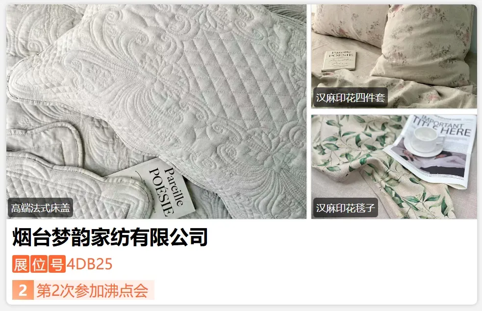 烟台梦韵家纺有限公司是一家做了10年家纺的公司,拥有两家工厂,2000 平仓库,主营:汉麻 ,亚麻(各种四件套,毯子,被子)天丝,高支贡缎,竹纤维。梦韵家纺有优秀的团队,一套产品从坯布-印花-绣花-缝制-成品,没有中间商赚差价,定期为客户推出新品,成交只是开始,服务永无止境。-展位号:4CB28-