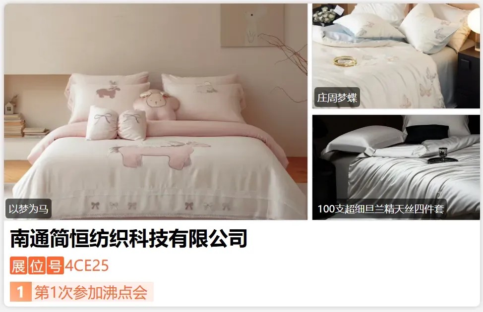 南通简恒纺织科技有限公司创立于2021年,是一家充满活力与创造力的年轻家纺企业,汇聚行业新锐力量,以敏锐的时尚触觉和持续的产品创新能力为核心驱动。简恒纺织始终聚焦市场前沿趋势,将科技、美学与舒适体验深度结合,致力于打造时代的家纺精品。凭借精准的研发与快反能力,简恒纺织已实现“年年有爆款”的市场佳绩,用实实在在的产品力赢得消费者信赖,持续为全球家庭注入美好生活新灵感。-展位号:4CL27-