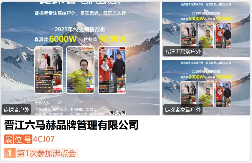 晋江六马赫品牌管理有限公司旗下运营徒探者高端户外、诗米克青少年潮牌两大自主核心品牌,同时代理Jeep Spirit、美津浓、瑞士军工(SWISS MILITARY) 等国际知 名品牌,覆盖高端户外机能、青少年潮流穿搭、美式休闲、专业运动、军工级硬核装备全场景。我们以品质为根基、以设计为驱动,整合全球供应链与品牌资源,为消费者提供兼具功能性、时尚感与高性价比的服饰产品。-展位号:4DG15-