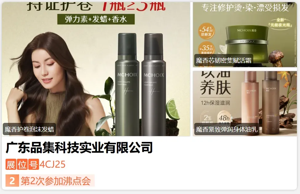 广东品集科技实业有限公司,拥有线上全渠道旗舰店+自有工厂。MCHOIX魔香是一个沙龙香氛美护生活方式品牌,以「香氛奢护 有感而美」为理念。-展位号:4CC25-