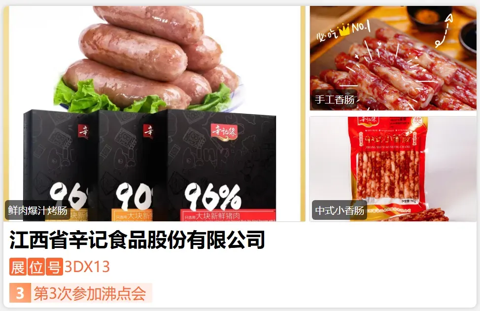 江西省辛记食品股份有限公司,新余市“老字号”企业,省农业产业化龙头企业,24年老牌肉制品源头工厂,“腊肠小串”开创者,供应全国各大食品企业,年销售额达5000万,连续7年被评为“江西省zhu名商标”,荣获CCTV“「预制菜争霸赛」-我最喜爱的预制菜”菜品奖。-展位号:3DD15-