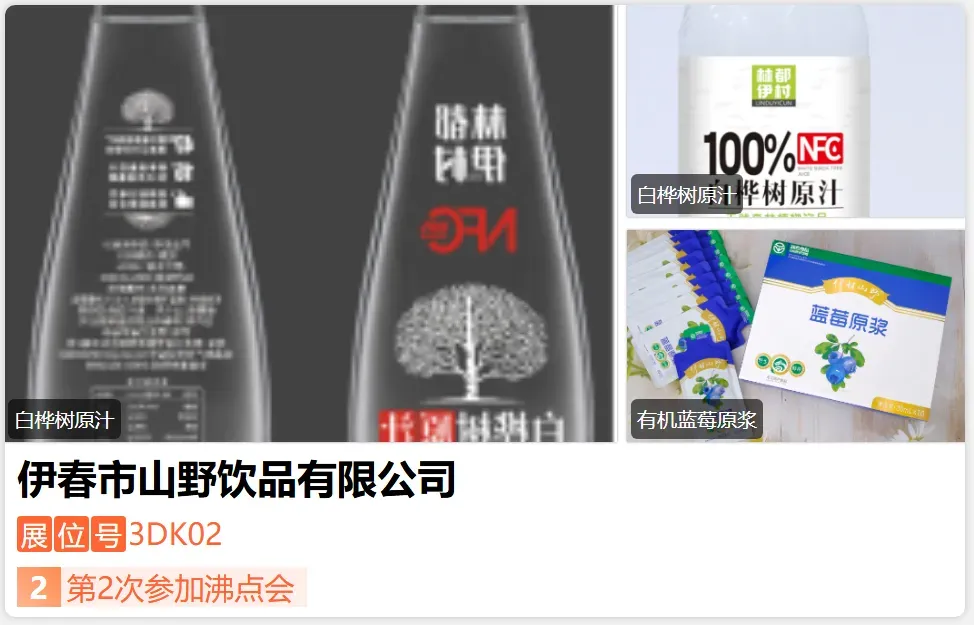 伊春市山野饮品有限公司始创于2003年,工厂坐落于伊春市金林区。依托小兴安岭-伊春绿色生态环境和丰富的野果资源,以“伊村山野”为品牌,构建起以蓝莓酒、饮料、果干、果酱和桦树汁五大系列50多个单品的产品体系。先后通过中国有机食品认证、国家绿色食品认证,获得了黑龙江省名牌产品、黑龙江省著 名商标、农产品地理标志、龙江特产食品、黑土优品和九珍十八品等诸多殊荣。-展位号:3DE15-