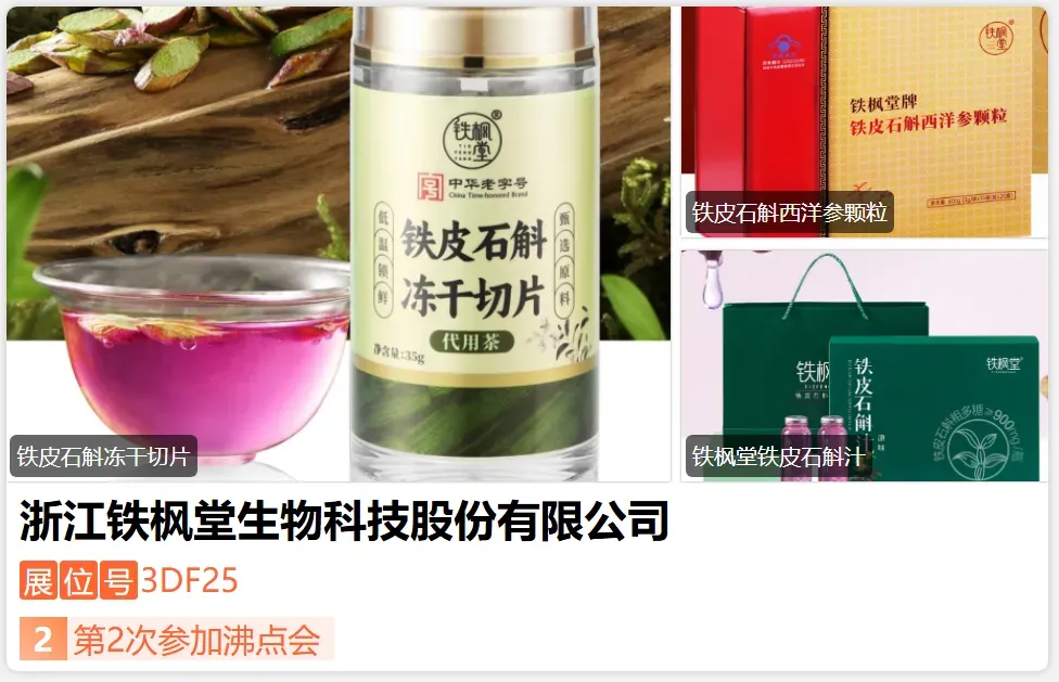 铁枫堂源于1840年,至今已有185年的传承历史,近年来荣获中华老字号、农业产业化国家重点龙头企业、“三无一全”优质中药材基地等殊荣。铁枫堂铁皮石斛现身央视CCTV1《本草流芳》、CCTV13新闻频道、积极亮相全国各大博览会,获奖颇丰,并上榜《2024胡润中国最 具历史文化底蕴品牌榜》,产品通过线上线下多元渠道销售,深受消费者喜爱。-展位号:3DA02-