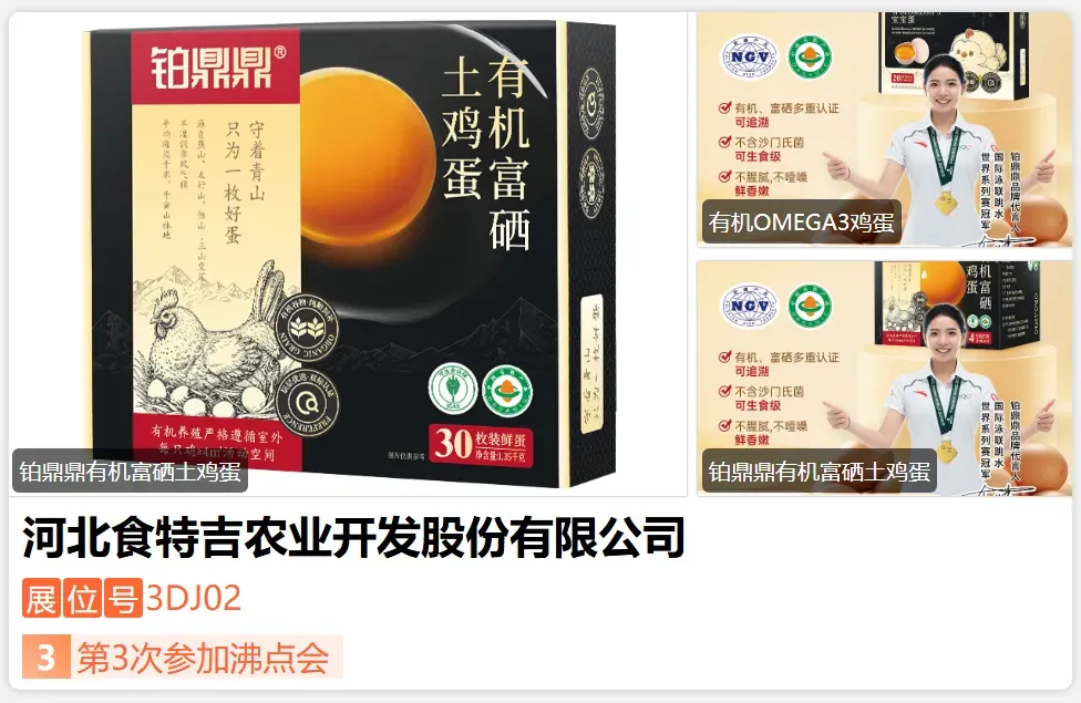 河北食特吉农业开发股份有限公司成立于 2017 年,品牌名:铂鼎鼎,专注畜禽养殖与农业开发的创新型企业,已成功登陆河北四板市场。公司自有 4 大有机养殖基地,稳定维持近 14 万只年存栏量,年产能可达 1200吨,企业是北京丰台区对口帮扶涞源的重点龙头扶贫企业,通过产业辐射帮扶 6 个村庄、近 500 人增收,在品质管控上,食特吉农业更以严苛标准斩获富硒、有机、可生食、福利非笼养、无抗无激素等权威认证。-展位号:3DC05-