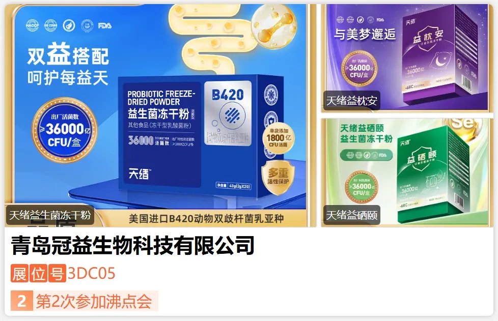 冠益生物致力于成为全球营养健康领域的***者,采用西方现代生物制药技术与中国传统中医药文化相结合,产品既有药食同源动植物萃取安全无***的优点,又有药品的强功能性,解决药品有***的问题,甄选专利菌株,株株有编号,携手中科院上海药物研究所、中国海洋大学、山东大学、青岛大学等全球前沿科研力量,持续开展科学营养、药食同源及其对慢病营养的干预研究,积极打造益生菌+药食同源的强功能性营养品。-展位号:3DB08-