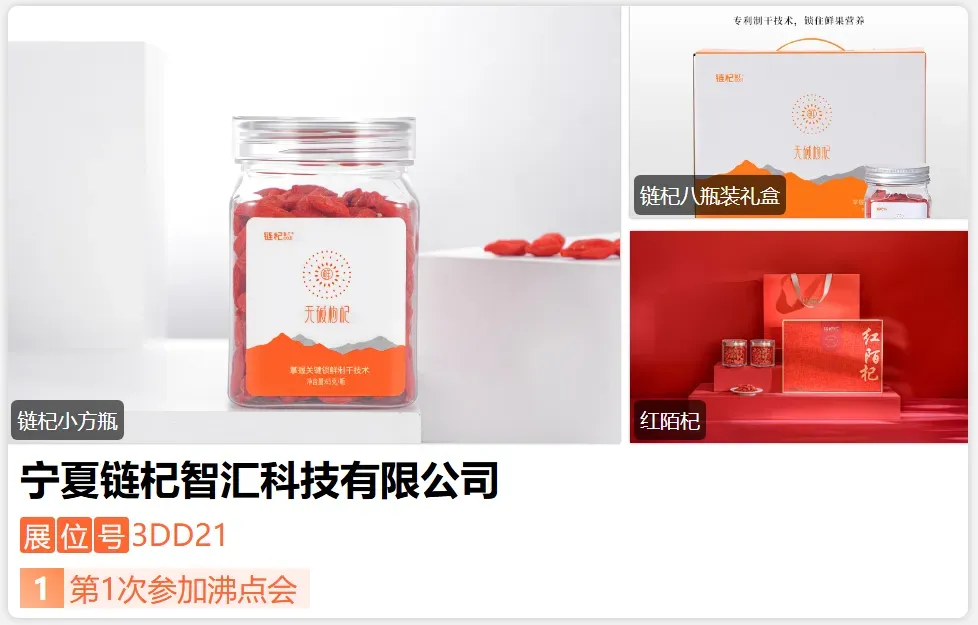 宁夏链杞智汇科技有限公司成立于2017年,深耕枸杞产业9年。作为国家高新技术企业、自治区专精特新企业,手握41项专利,其无碱枸杞干燥机获宁夏首台(套)认定。公司主打锁鲜枸杞礼盒等产品,获国家高新技术企业、自治区瞪羚企业认证。客户涵盖农特产品经销商及礼品渠道商,合作伙伴还包括本心源、宝丰集团等,形成“技术+产销”协同优势,是枸杞高端礼盒领域标杆。-展位号:3DG05-
