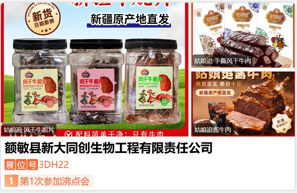 额敏县新大同创生物工程有限责任公司 2011 年成立,是塔城地区特色肉制品加工重点龙头企业、新疆 “专精特新” 中小企业,主营哈萨克风干肉、牛肉干等,主打 “姑娘追” 品牌。公司拥有完整农牧加工产业链,传承民族风干秘技并融合现代工艺,获多项专利与 ISO9001 认证,产品严选优质原料,线下经销覆盖十余省区,线上布局主流电商平台,冷链配送全国,是新疆特色肉制品标杆企业。-展位号:3DK26-