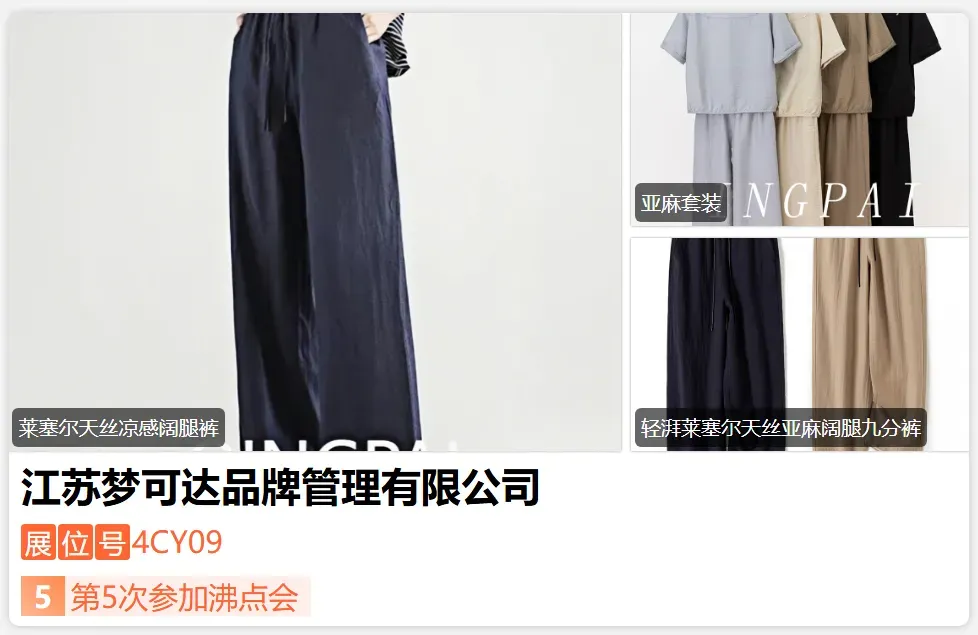 江苏梦可达品牌管理有限公司主要做品牌孵化管理,自主生产设计款式,品牌合作运营品牌战略合作。旗下自主品牌:QINGPAI轻湃服饰,主营30+轻熟女装男装,羊绒类,内裤,保暖套装,家居服,保暖背心等内衣类。梦可达取得多个专利面料,日产1万+,发货日发10万单,可溯源可贴牌。-展位号:4CB17-