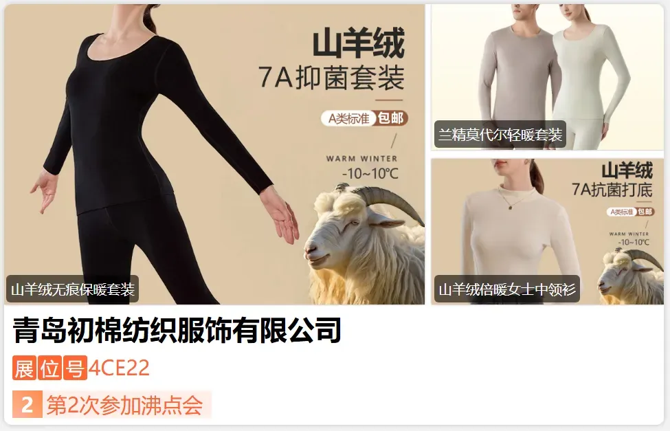 青岛初棉纺织服饰有限公司创立于2014年理念】以科技、健康、舒适为产品理念以“家庭贴身衣物大管家”为使命,专注健康舒适型内衣,全力打造高品质贴身衣物品牌。建筑面积3000多平方米,员工200余名。初棉设有6道品控检验程序从验布裁剪、缝纫、整烫、包装全工序全量严格质检。所有面料都经过高标准的预缩水及抗起球处理,生产的成品均有行业机构检测报告,通过相关测试,保证产品的质量。-展位号:4CX06-
