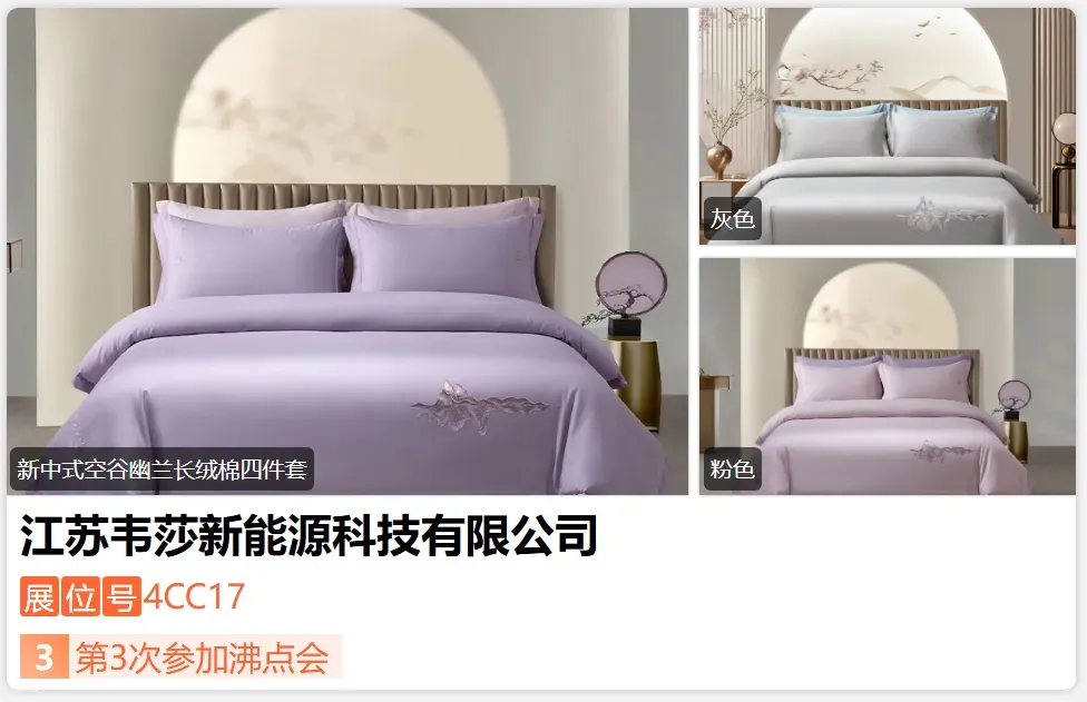 江苏韦莎新能源科技有限公司成立于 2016 年,秉持 “链接你我,创造分享” 的核心理念,掌控全产业链布局,可提供定制、集采、ODM、一件代发等多元服务,覆盖家居全品类;企业以***精致生活为愿景,打造消费者感知的差异化为目标,稳步深耕家居领域!2024 年公司荣获水星家纺 “战略合作供应商” 称号。-展位号:4CC01-