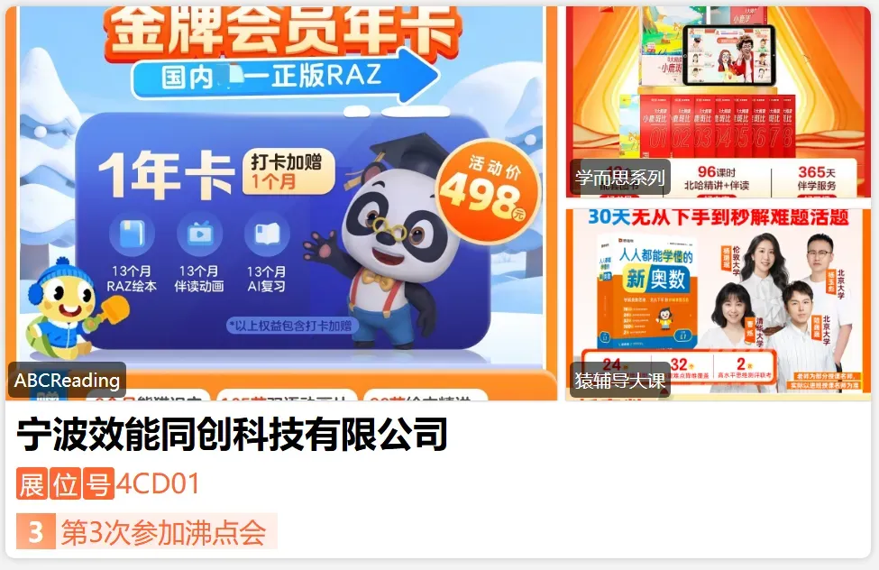 宁波效能同创科技有限公司成立于2019年,***高新技术企业,科技型中小企业,头部教育集团***战略合作伙伴。效能同创始终深耕于教育启蒙培训,亲子阅读APP产品的推广传播,致力打造成为一个有使命、有爱心、有文化的教育传播者。自成立以来,为广大家庭构建一条链接优质教育资源的桥梁,效能同创始终秉持着“让孩子正确成长,助力千万家庭幸福圆满”的使命,为此,我们一直在路上。-展位号:4CF03-