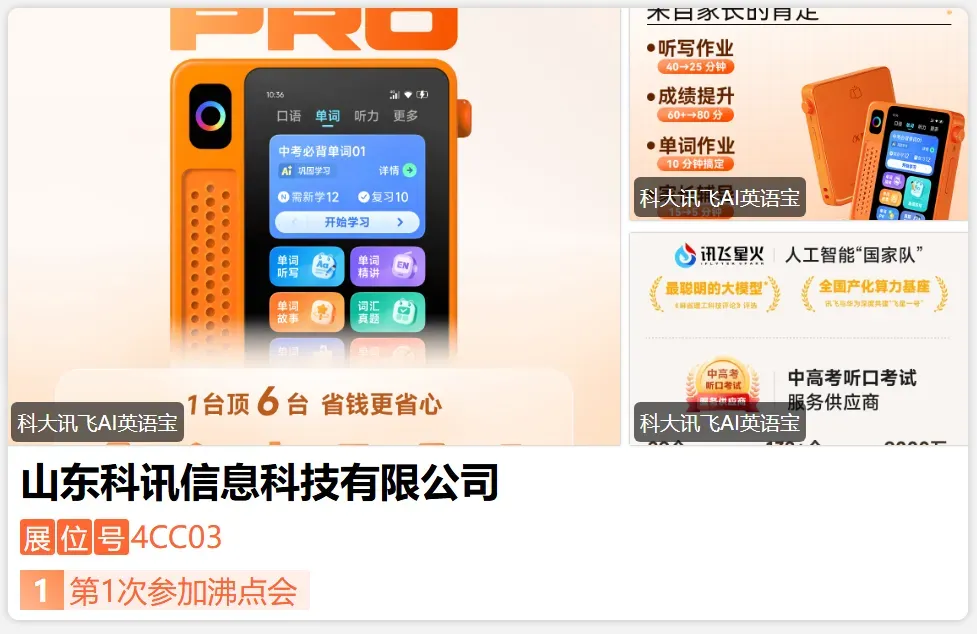 科大讯飞是一家千亿市值的上市公司,深耕校内教育21年,与5万+所中小学合作,服务师生1.3亿人,也是中高考同源评测技术提供方。同时,讯飞也是人工智能“国家队”,专注人工智能核心技术研发27年,获得过70项国际人工智能大赛***和国家科学技术进步奖一等奖以及国家专利金奖两度获奖。其自研的“讯飞星火大模型”背靠人工智能核心技术,立足于教育大数据优势应用于“讯飞英语宝”、“讯飞学习机”等核心教育硬件。-展位号:4CK25-
