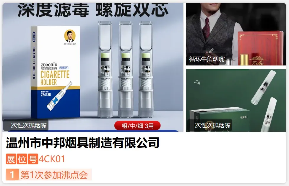 温州市中邦烟具制造有限公司,1988年创办,是集产品设计、开发、制造、销售于一体的专业股份制烟具企业,。公司品牌(jobon中邦、zobo正牌,CHIEF首领)三大品牌,主营高中档金属打火机、烟嘴等烟具礼品,烟嘴涵盖清洗、换芯、抛弃等多过滤类型,是国内烟具品类最全的生产企业之一。目前产品远销全球,海外设多个销售分支,未来将秉持创新理念,融科技、品质、服务于一体。-展位号:4CY12-