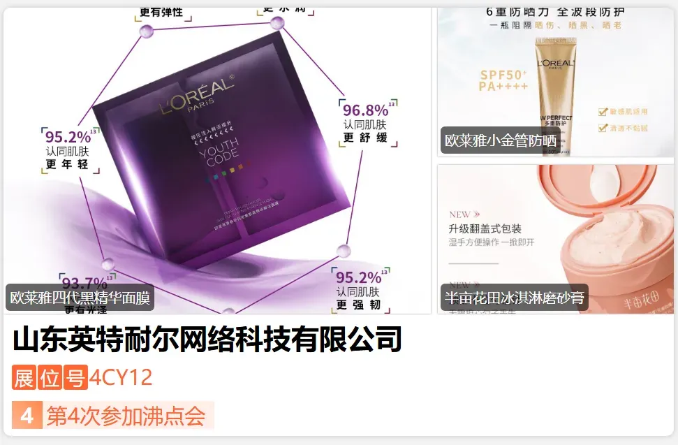 山东英特耐尔网络科技有限公司坐落于山东省济南市。公司主营欧莱雅、半亩花田、资生堂、玉兰油等国内外品牌的代理和供应。公司致力于为渠道提供优质商品为己任,整合了国内外上百个品牌产品及中小样,为终端商、电商达人及团长提供长期稳定的美妆供应服务。-展位号:4CA02-