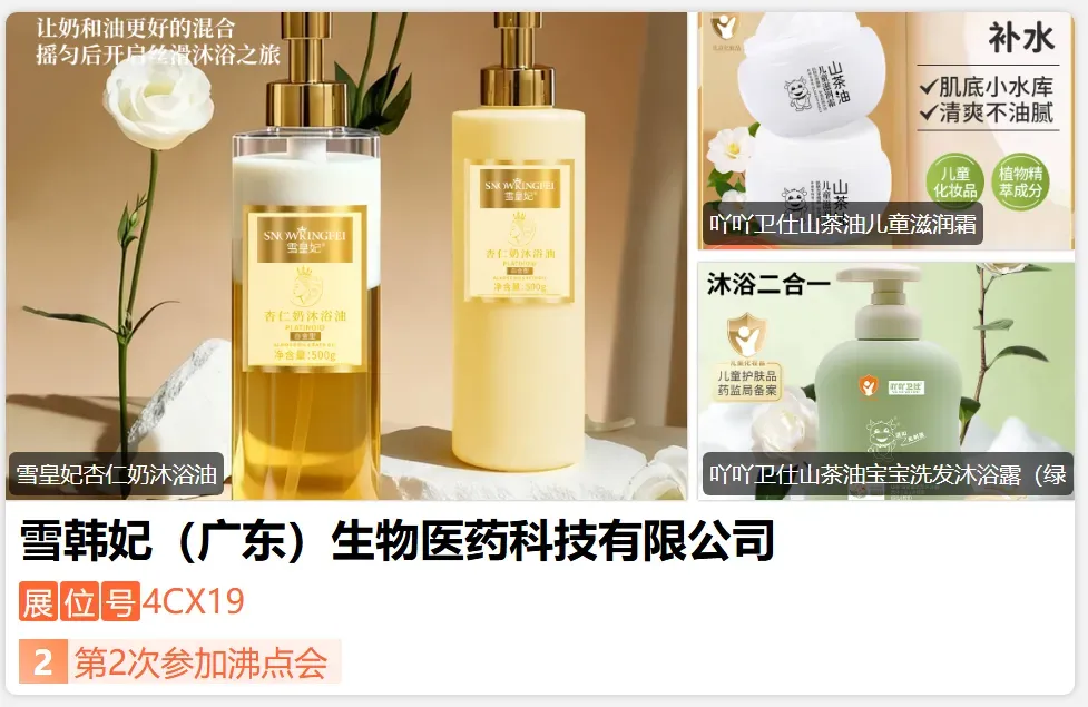 雪韩妃(广东)生物医药有限公司是一家集产品研发、生产、品牌营销为一体的大型专业化妆品企,于2002年成立于化妆品之都广州,专注于不同年龄的人群护肤洗护的产品,是自有工厂,自有品牌,自有研发团队,工厂有20条全自动生产线。雪韩妃旗下有儿童品牌吖吖卫仕,青少年品牌木兰少年,成人品牌雪皇妃(主要针对银发经济开发的产品),公司有完善的发货团队 ,完整的售后团队!!-展位号:4CJ05-