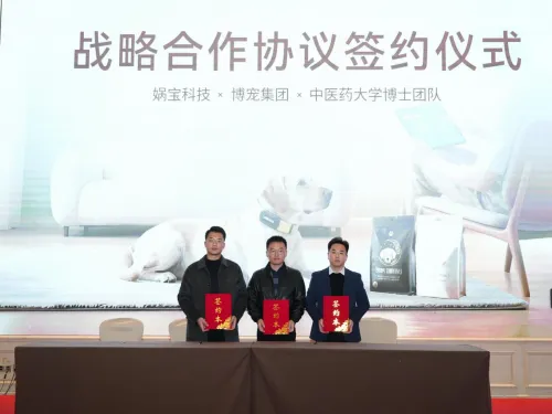 发布会上,娲宝科技、博宠集团及中医药大学博士团队共同签署战略合作协议,计划通过多学科协同,推动宠物食品向更科学、更精准的方向升级。