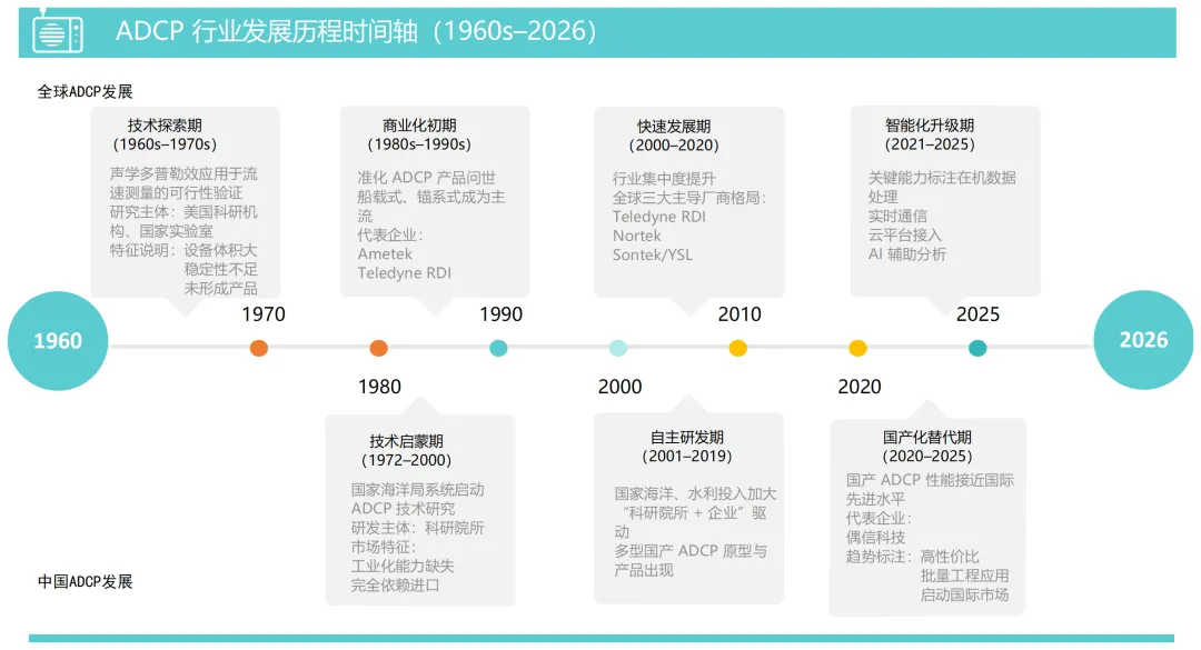ADCP行业发展是声学技术、电子技术与水文观测需求协同迭代的过程,全球与中国发展既关联又具差异化,整体分为多个阶段。