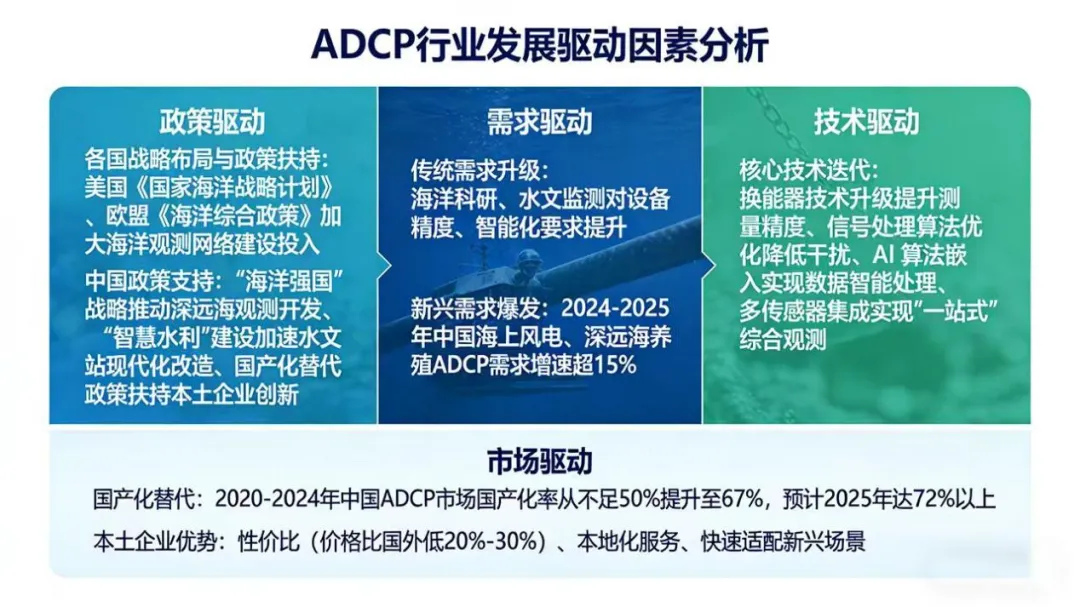 ADCP行业发展由政策、需求、技术、市场四大因素协同驱动,政策与需求为核心驱动力,技术为关键支撑,市场竞争与国产化替代为重要助推力。