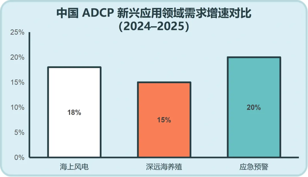 ADCP应用从传统场景延伸至海上风电、深远海养殖、海底电缆监测等新兴领域。2024年中国海上风电新增装机超10GW,带动ADCP需求同比增长18%;深远海养殖需求增速超15%;应急预警领域2025年需求增速预计超20%,新兴领域成为增长核心。