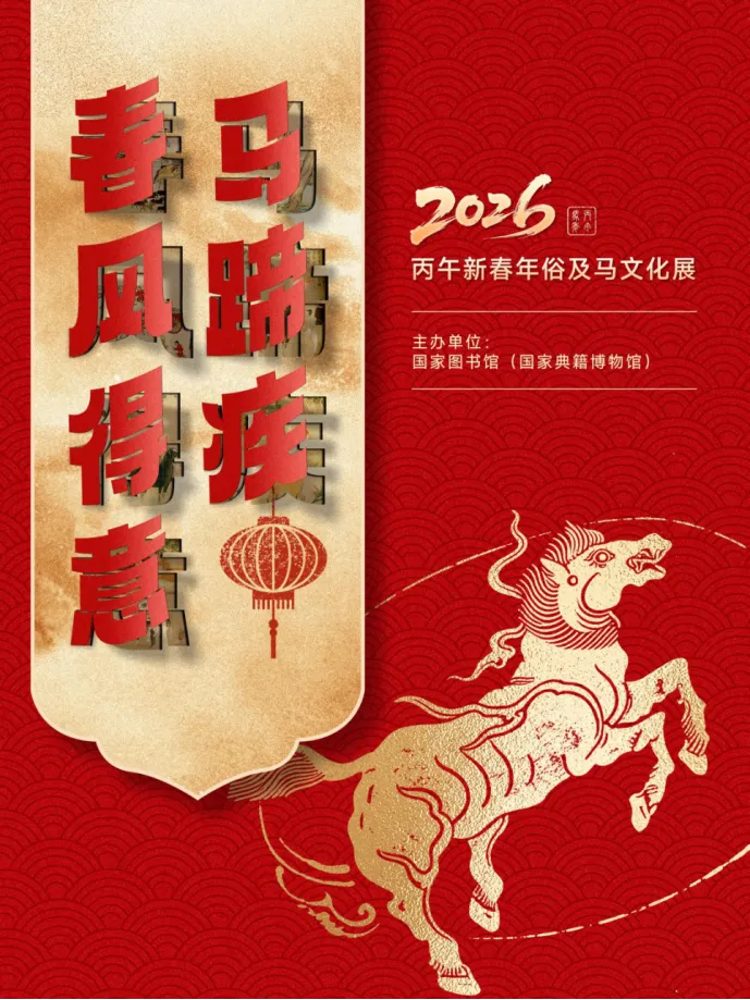 2025年12月,《全民阅读促进条例》正式发布,为传承中华优秀传统文化、促进全民阅读、推进书香社会建设,提供了法规依据。在丙午马年新春到来之际,为深入贯彻习近平文化思想,进一步传承弘扬中华优秀传统文化,更好满足人民精神文化需求,营造和谐新春氛围,我馆积极响应国家图书馆和中国图书馆学会组织开展的2026年“策马迎春 阅享新年”全国春节主题活动,依托国家图书馆(国家典籍博物馆)的丰富资源,特别推出“春风得意马蹄疾——丙午新春年俗及马文化展”。让广大读者共享文化盛宴,共贺新春。本次展览以昂扬奋进的“马”为核心意象,分为“驭风韵俗”、“竣功昭世”、“文典寻骢”、“骐骝骅骥”四大单元,通过数字化形式,带领大家沉浸式领略春节年俗与马文化魅力。