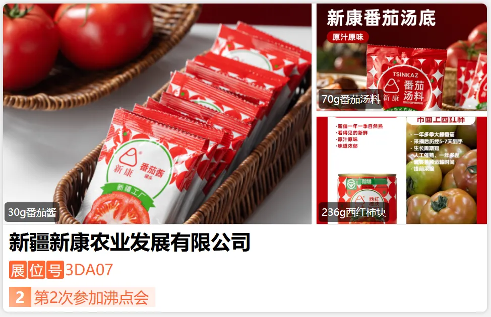 新疆新康农业发展有限公司是外向型,科研型,生产型的跨国食品企业,树立新康食品,新鲜健康的经营理念,开发出特色番茄制品、辣椒酱制品、蔬菜罐头、纯果酱等四大类百余种产品,建立产品无添加香精、无添加色素、无添加防腐剂的安全质量控制体系,实现产品从研发创新到生产制造和终端销售的全产业链运营模式。 企业新康品牌被评为中国驰 名商标。新康追求品质生活,形象定位为清新时尚、温馨美好,目标是成为中亚一 流的食品研发机构!-展位号:3DJ02-