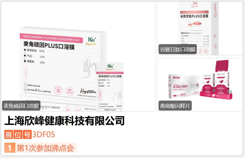 上海欣峰健康科技有限公司是上海欣峰制药有限公司的全资子公司,成立于 2022 年 6 月,专注于口溶膜闪释片食品研发生产。公司拥有***工艺技术和十余项专利,产品具有 3-30 秒口腔速溶、无需水服、生物利用度高的优势。获食品和特殊膳食双生产许可证,通过 BRC、HACCP 等权威认证,是国内***专注口溶膜闪释片的 CDMO/CMO 平台,提供从研发到生产的一站式解决方案。-展位号:3DA08-