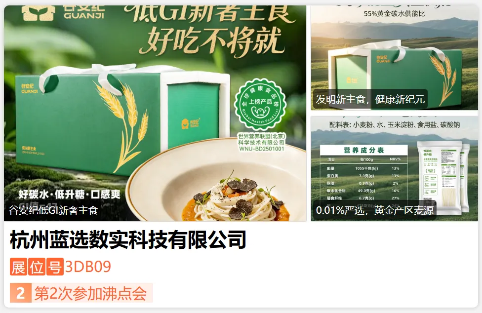 蓝选数实科技有限公司是干将集团旗下专注于大健康领域的科技子公司。秉承"科技赋能健康生活"的理念,依托集团科研实力与全球资源,聚焦低GI精准营养赛道,致力于推动低升糖指数(低GI)主食革命。公司通过自主研发与科技创新技术,构建低GI"精准营养"主食体系,以此开创新奢主食"全新品类,并提供智能健康管理解决方案,帮助用户重塑日常饮食,开启由内而外的健康生活质态。-展位号:3DJ19-