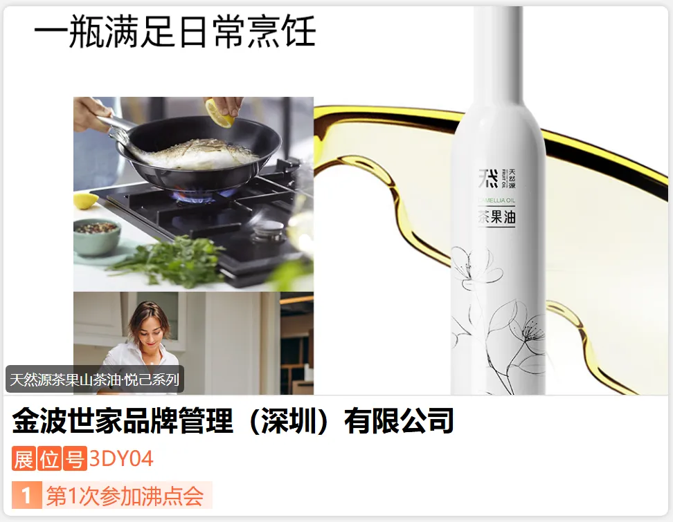 湖南金波茶油有限公司是一家从事油脂产品研发、生产与供应的现代化制造企业,业务涵盖茶果山茶油及相关植物油脂的原料种植与管理、产品研发、加工制造、大宗供应及 OEM 定制服务,为国内外客户提供稳定、规范、可信赖的油脂产品解决方案。目前,已打造并运营「天然源」、「TRYNME」等成熟品牌,以满足不同消费人群的使用场景,传递健康、自然、高品质的生活理念。-展位号:3DJ10-