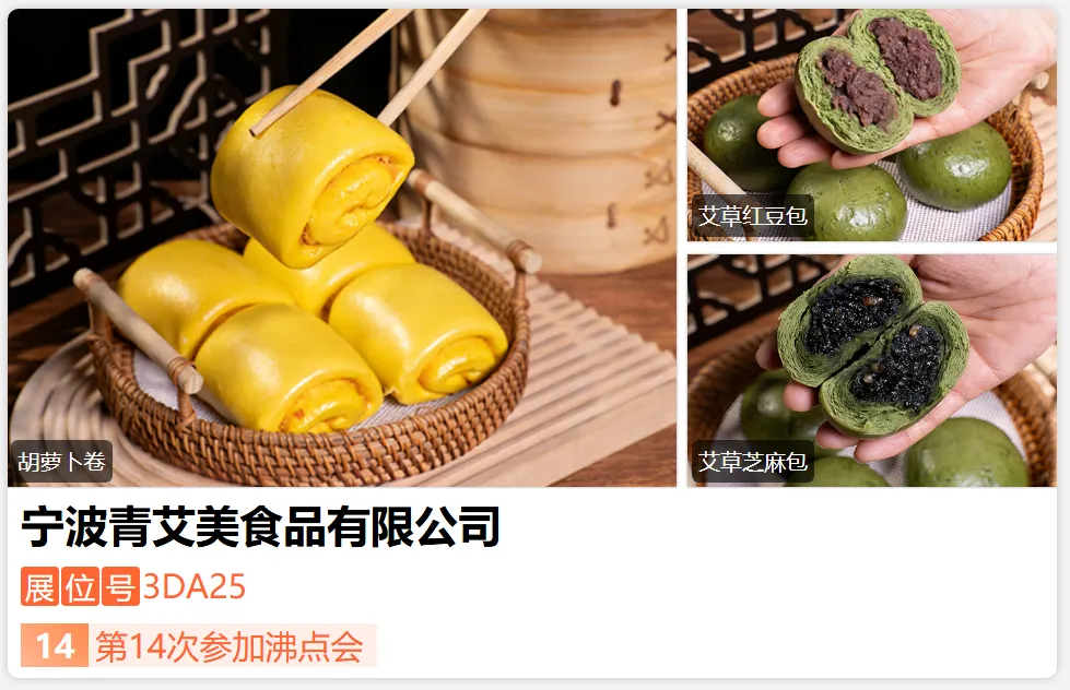 宁波青艾美食品有限公司成立于2025年,总部位于宁波市宁海县,总面积 1 8 0 0平方米。是一家专注于健康食品研发、生产和销售的现代化企业。本司严选新鲜食材、标准化锁鲜工艺及全程可溯品控体系,特色产品有艾草馒头、艾草夹心包、胡萝卜卷、鲜肉包等。-展位号:3DG21-