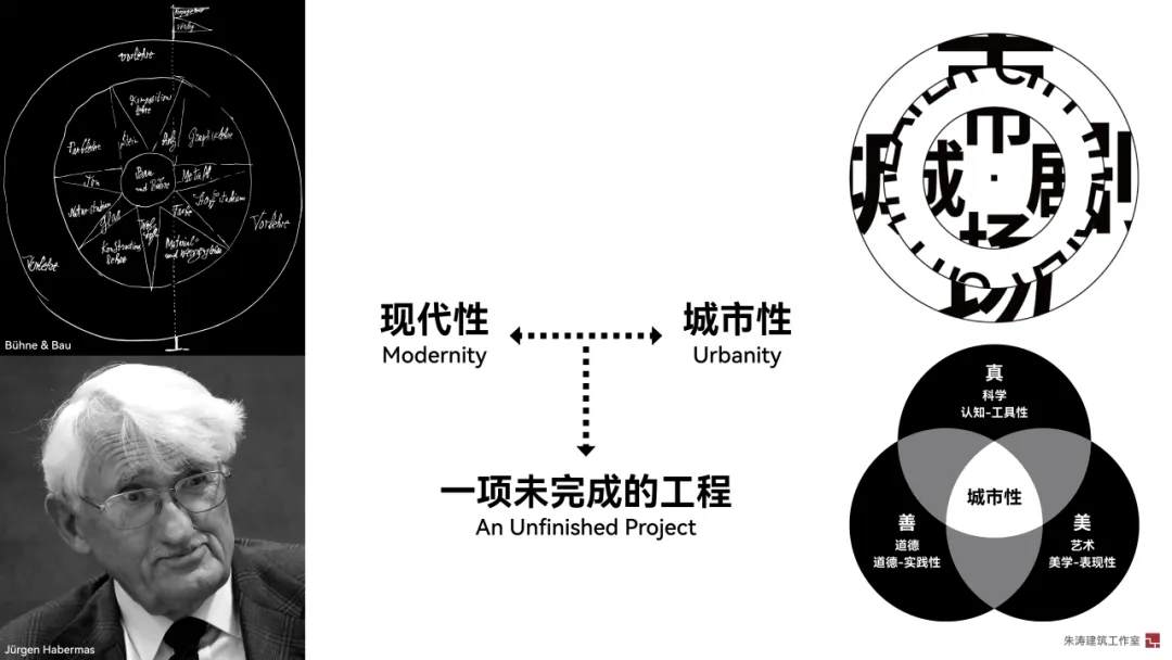 在空间上,包豪斯曾将“剧场”(Bühne)与“建造”(Bau) 并列为教学内核,以期探索出一种广义的、兼具美学创新和社会推动、持续开放的空间实践;在政治上,阿伦特曾将那些开辟人类历史新篇章的“行动”比喻为“演出”——演出者将自己最杰出的行为呈现出来,并坦然接受后果的不确定性;在哲学上,哈贝马斯认为现代性工程将人类知识分为真善美三大领域,其本身是有意义的,但三者间的缺乏交流,导致了二十世纪普遍的现代性危机。因此,现代性在他看来,仍是一项有意义的、“未完成的工程”。