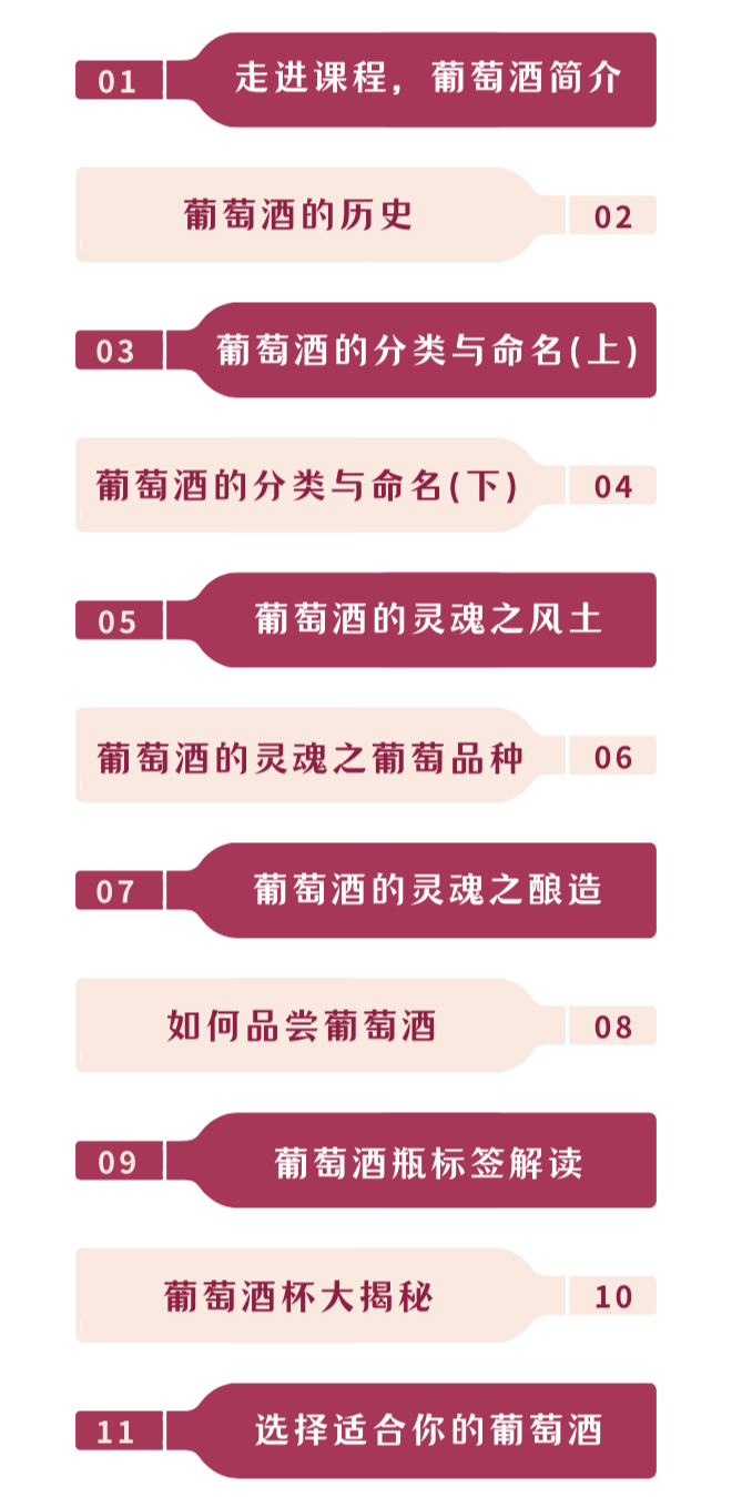 本课程将从葡萄种植与葡萄酒的酿造历史到葡萄酒的发展与品鉴,带领大家探索葡萄酒世界的奥秘。