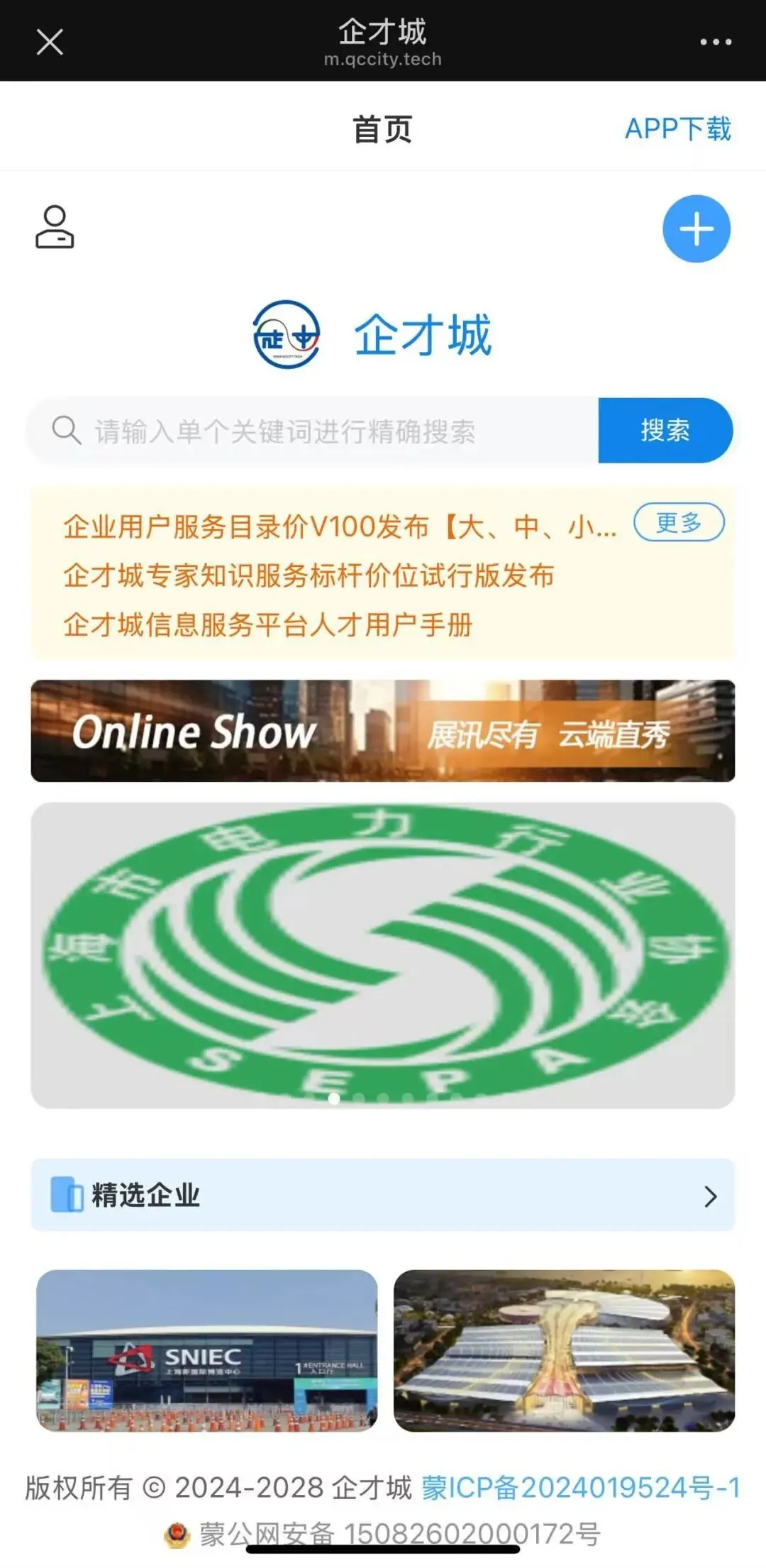 在 PC 端基础上,新增 onlineShow 功能入口(顶部 Banner 下方 “展会服务” 按钮),点击直接进入全国会展中心地图,无缝衔接展会场景;