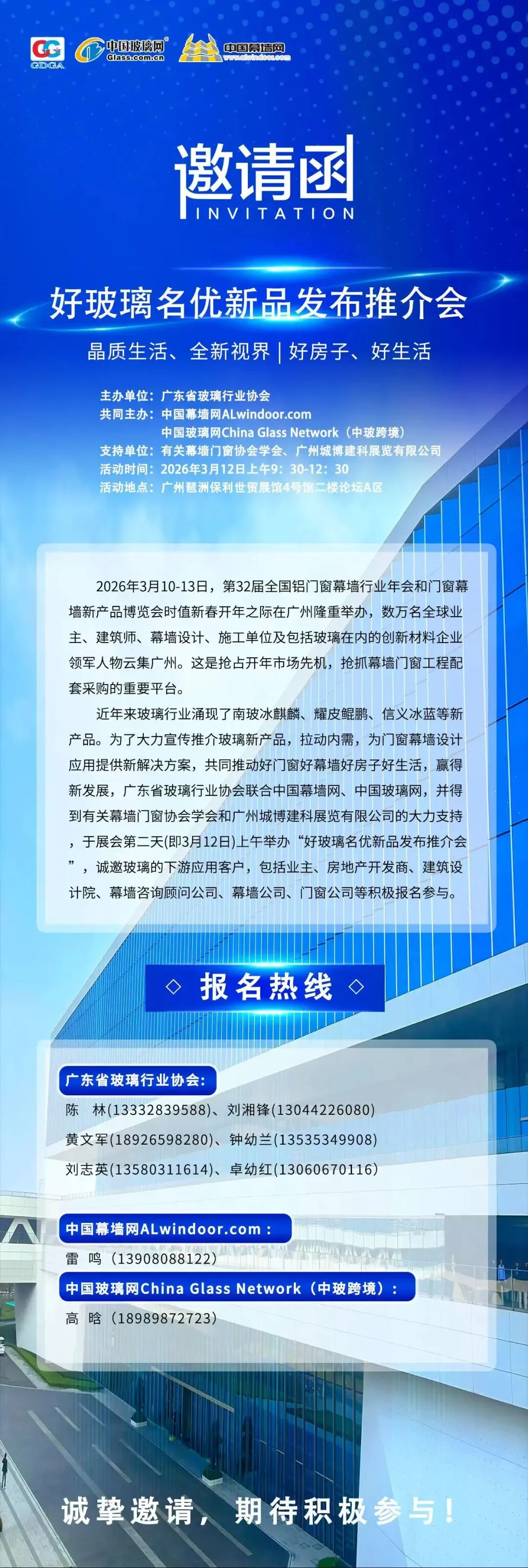 近年来玻璃行业涌现了南玻冰麒麟、耀皮鲲鹏、信义冰蓝等新产品。为了大力宣传推介玻璃新产品,拉动内需,为门窗幕墙设计应用提供新解决方案,共同推动好门窗好幕墙好房子好生活,赢得新发展,广东省玻璃行业协会联合中国幕墙网、中国玻璃网,并得到有关幕墙门窗协会学会和广州城博建科展览有限公司的大力支持,于展会第二天(即3月12日)上午举办“好玻璃名优新品发布推介会”,诚邀玻璃的下游应用客户,包括业主、房地产开发商、建筑设计院、幕墙咨询顾问公司、幕墙公司、门窗公司等积极报名参与。