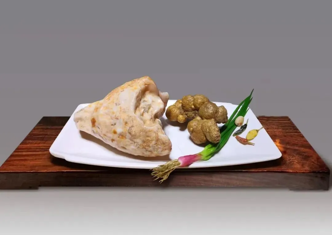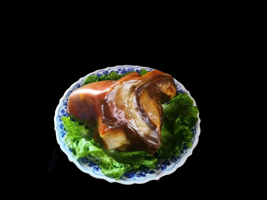 一方天然水冲的黄龙玉石,出落的酷似东坡肘子,形满质润色真,皮滑肉酥、肥而不腻,入口即化。