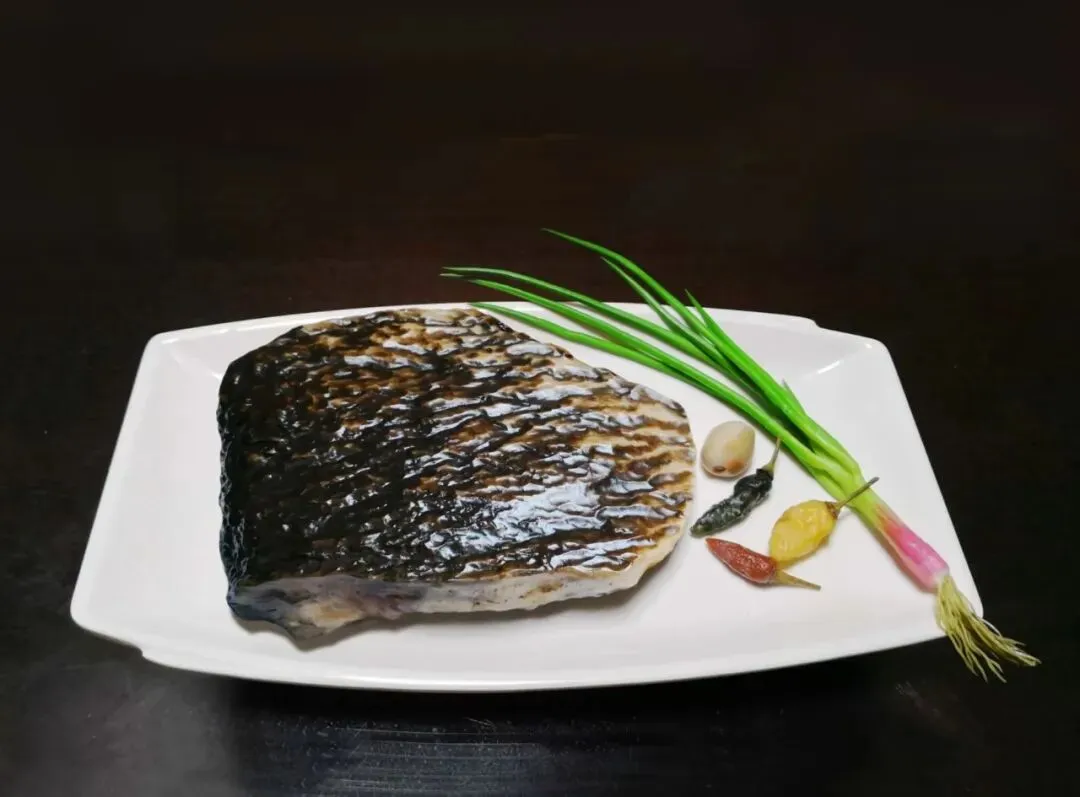 这并非青鱼段,而是一方象形度极高的观赏石。它静置于白色盘中,整体蜷曲如鱼段,表面黑褐相间的纹理自然天成——细密的“鱼鳞”层层叠覆,脊背处的“鱼骨”纹路清晰可辨,鱼腹处的“肌理”细腻通透,石肤泛着生鲜鱼肉般的水润光泽,仿若刚剖杀的鲜鱼,带着未经烹饪的鲜活质感。旁侧点缀的葱段、红黄辣椒,与石体色泽相映成趣,恰似精心调配的佐料,将观赏石幻化为“盘中生鲜”。这种打破常规的展示方式,既凸显了奇石惟妙惟肖的自然造化,又以生活美学的巧思,让冰冷石头兼具烟火气与艺术感,诠释了人们对自然之物别出心裁的审美意趣。