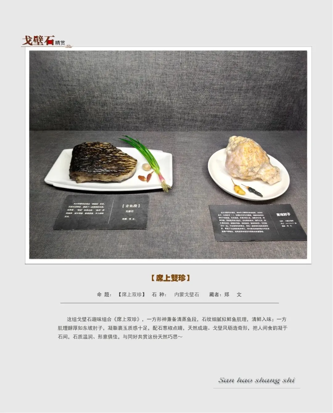 这组“席上双珍”戈壁石组合,以天然肌理还原食馐之妙。"清蒸鱼段”石纹细腻如鲜鱼肌理,清润通透尽显本味;“东坡肘子”凝脂裹玉尽显肥润质感,佐以配石葱椒,将饮食文化与奇石美学精妙融合,是戈壁石中极具趣味性的收藏。
