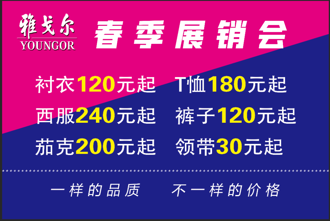 衬衣裤子120元起,T恤180元起,领带30元起,西服240元起,茄克200元起