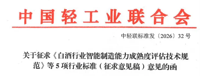 根据《工业和信息化部办公厅关于印发2025年第二批行业标准制修订和外文版项目计划的通知》(工信厅科函[2025]210号)文件要求,由中国轻工业联合会归口,中国食品发酵工业研究院牵头起草的《白酒行业智能制造能力成熟度评估技术规范》、《智能制造 白酒行业应用 生产过程智能监控平台技术要求》、《智能制造 白酒行业应用 智能分级入库系统技术要求》、《智能制造 白酒行业应用 智能投配料系统技术要求》和《智能制造 白酒行业应用 智能摘酒系统技术要求》(计划编号分别为:2025-0363T-QB、2025-0364T-QB 、2025-0365T-QB、2025-0366T-QB和2025-0367T-QB)行业标准计划项目已完成起草工作,现公开征求意见。请于2026年3月15日前将《意见反馈表》以电子邮件形式反馈至中国食品发酵工业研究院或中国轻工业联合会质量标准部,逾期视为无意见。