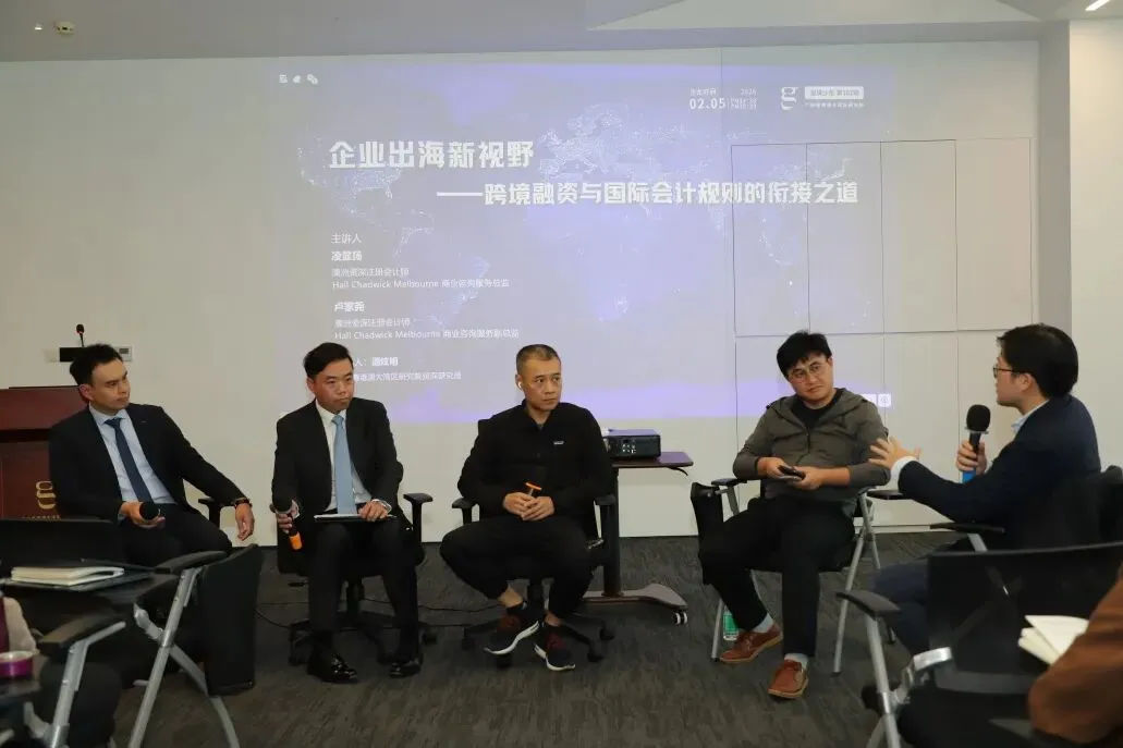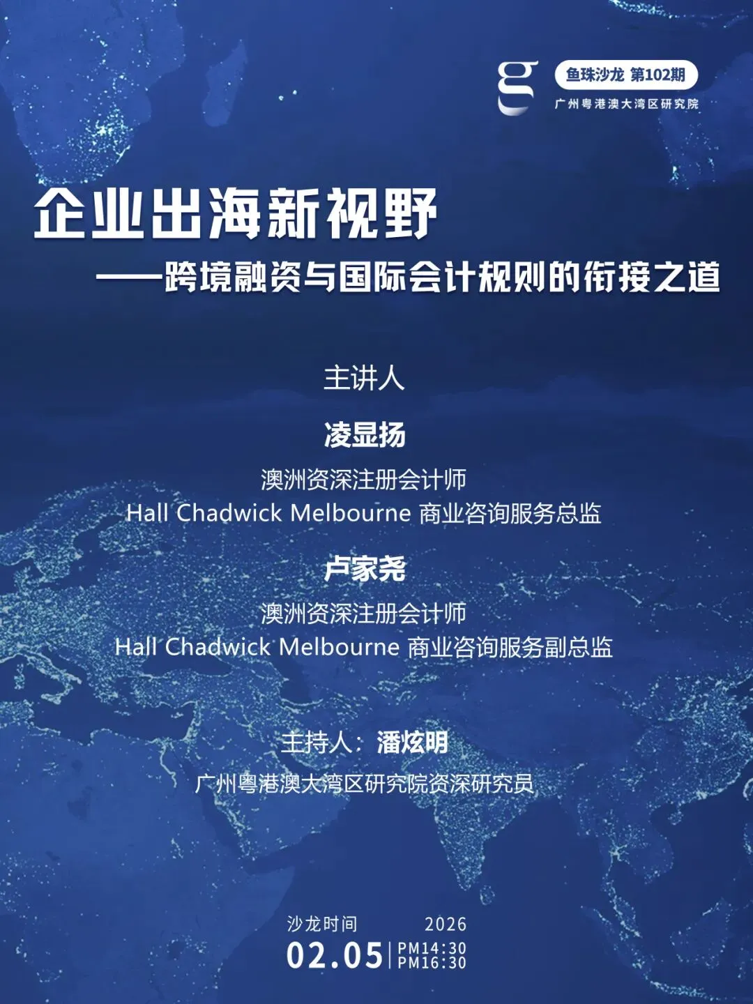 2026年2月5日,由广州粤港澳大湾区研究院、香港太平洋协会和澳洲会计师公会联合主办的鱼珠沙龙《企业出海新视野:跨境融资与国际会计规则的衔接之道》在广州国际港航中心43楼举行。此次沙龙由研究院资深研究员潘炫明主持,Hall Chadwick Melbourne 商业咨询服务总监凌显扬进行导入介绍,围绕国际会计准则 IFRS与各地地区准则的异同对中国企业跨境发展、融资的影响,由澳洲资深注册会计师、Hall Chadwick Melbourne 商业咨询服务副总监卢家尧等嘉宾进行专题分享。