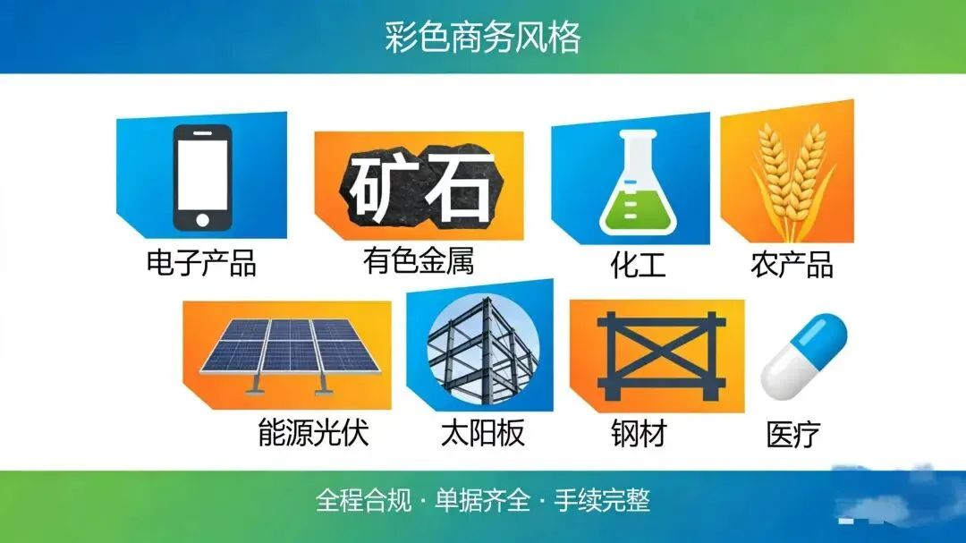 电子产品、有色金属、化工、农产品、能源光伏、钢材、医疗等,全程合规操作,单据齐全,手续完整。