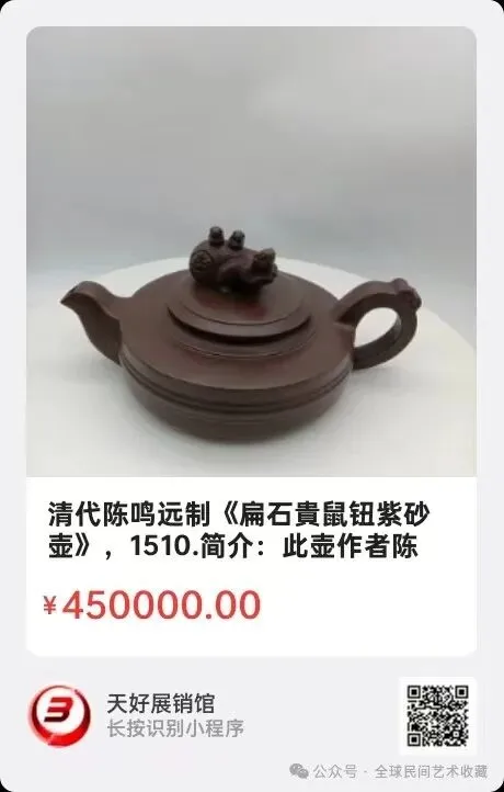 清代陈鸣远制《扁石貴鼠钮紫砂壶》,高9.5㎝,横宽21.8㎝,底径6.5㎝。简介:此壶作者陈呜远,清康熙年间宜兴紫砂壶制作大师。号壶隐,石霞山人。陈鸣远作品造型装饰讲究,不断创新,他设计制作的紫砂壶使用了青铜器、树段,竹木花果等造型,开发了浮雕诗文,壶泥加彩等工艺。上述“扁石贵松鼠钮壶”,艺术精湛,鼠族招财,向征着吉祥!来源1510.V.