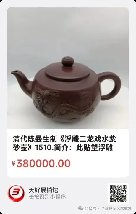 清代陈曼生制《浮雕二龙戏水紫砂壶》,高10㎝,横宽19㎝,底径6.8㎝。简介:此贴塑浮雕二龙戏水紫砂壶,是清代陈曼生(名鸿寿)设计,杨彭年制作,二人珠连璧合,在乾隆至道光年间合作制作了大量精美神壶。陈曼生十八式,三十八式紫砂壶等不同款式小壶,被后世多种版本典籍收集。此壶底戳【阿曼陀室】,为陈曼生用名,盖内:“彭年”字戳。来源1510..V.