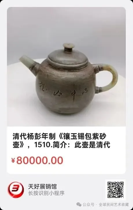清代杨彭年制《镶玉锡包紫砂壶》,高10㎝,横宽15.8㎝,底径4.2㎝。简介:此壶是清代大师杨彭年作,壶把,咀,钮嵌镶玉料,壶身镀锡泊,彰显华贵灵气。此壶为使用过的紫砂壶,表现出了沧桑感。来源1510.V.
