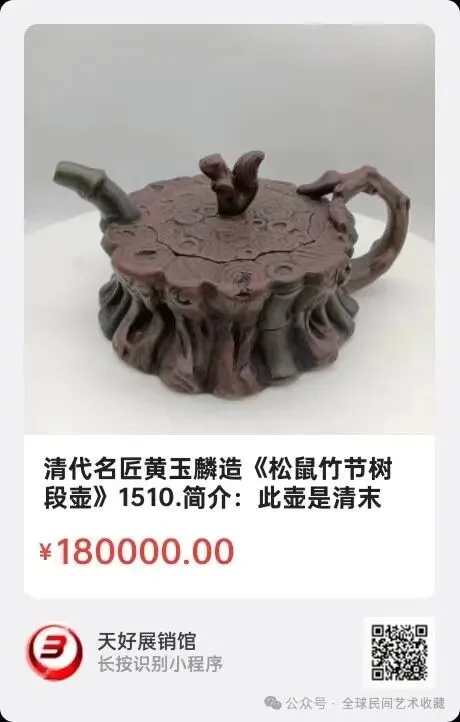 清代名匠黄玉麟造《松鼠竹节树段壶》,高10㎝,横宽18.5㎝,底径12.5㎝。简介:此壶是清末宜兴造壶名坊名匠黄玉麟所作,仿欧正春作品,松鼠钮,竹节嘴,树痹把,树段捆绑状紫砂壶,形象逼真生动,水木相宜,向征吉祥。来源1510.V.
