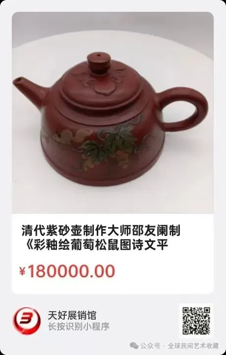 清代紫砂壶制作大师邵友阑制《彩釉绘葡萄松鼠图诗文平底壶》高7.9㎝,横宽16㎝,底径11.7㎝。简介:邵友阑是清代雍正,乾隆年间紫砂壶制作大师,曾承制宫廷御器,彩釉绘饰较多,底戳多用“友阑秘制”,印缘有花边。上述紫砂壶,制作细腻,造型典雅,有文人墨客使用之气质。来源1510.V.