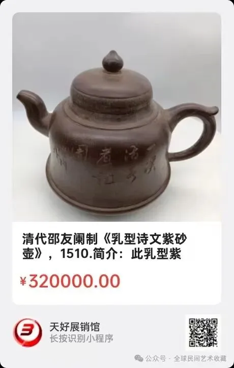 清代邵友阑制《乳型诗文紫砂壶》简介:此乳型紫砂壶,系邵友阑乾隆年间制作,壶一侧刻划“喜鹊登梅”图,另侧刻诗文:一溪活水煮龙团,潜沟作。来源1510.V。