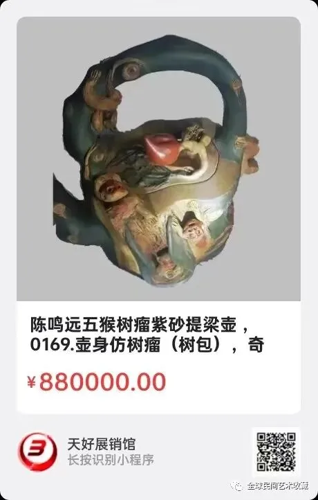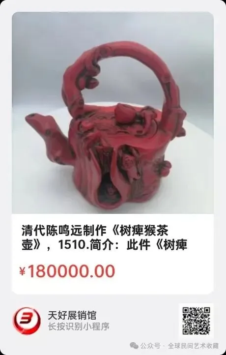 清代陈鸣远制作《树痺猴茶壶》,壶重786克,高16.5㎝,底棱形8.8X11.2㎝,横长17㎝。简介:此件《树痺猴茶壶》系清代紫砂壶制作大师陈鸣远作。用台湾深海料,紫砂壶传统“树痺”器型,利用空间增设浮雕了几只弥猴,神、形态各异,生动活泼,为红色茶壶增添了灵动性。此壶为大海天然物质,比紫砂壶尤显珍贵,具有名匠名壶之誉,体现了高超的技艺与艺术价值!来源1510.V.