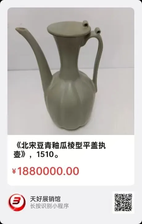 《北宋豆青釉瓜棱型平盖执壶》,高22.5㎝,口径6.3㎝,底径7㎝。简介:此豆青釉瓜棱形平盖执壶是北宋中期官窑烧造,胎薄且坚,釉色豆青而润,美如琢玉,后人有称“隐青”,此壶釉面与汝窑有别。造型如瓜棱,长颈撇口,平盖,与壶把有双系孔,工艺设计精湛,瓷器优雅秀美!是北宋时期一款典型的礼器物,如今十分珍罕!来源1510.V.