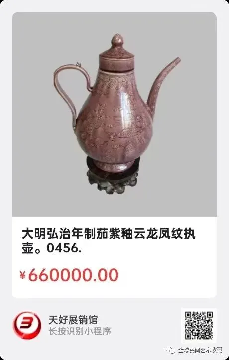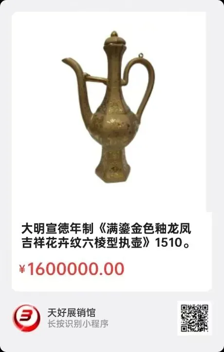 大明宣徳年制《满鎏金色釉龙凤吉祥花卉纹六棱型执壶》高34㎝,口径5㎝,底径9.8㎝。简介:此壶满鎏金色,乌金色底釉,纯金勾彩图纹,金光璀璨,是宣徳宫廷艺术的浓缩体现,真可谓:棱骨铮铮显雄魄,金龙盘之慑乾坤,鎏金溢彩昭天威!该执壶六棱型,上下十余层绘图设计,有龙凤纹,八宝纹,花卉纹,双弘纹,双回纹等多种纹饰,丰富饱满多“彩”。该壶设计典雅秀美,是明代鼎盛时期皇权与艺术审美的代表精品!此壶鎏金滋彩,彰显雍容华贵,既有盛酒实用性,又是宫廷皇帝赐赏重臣与家眷,举办宫宴的珍贵礼嚣!该壶工艺精湛,留存珍罕,是难得的明宣徳高端文物艺术品。来源1510.V.